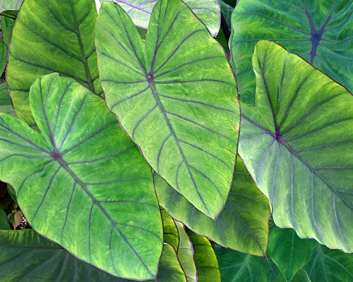 Colocasia ‘Blue Hawaii’ is a refined and elegant elephant ear variety featuring large, bluish-green leaves with dramatic dark purple veins and petioles. The foliage has a slightly puckered, matte texture that adds dimension and interest, especially when backlit by the sun. This variety offers a more upright and tidy form, making it a beautiful focal point in garden beds, borders, or containers.