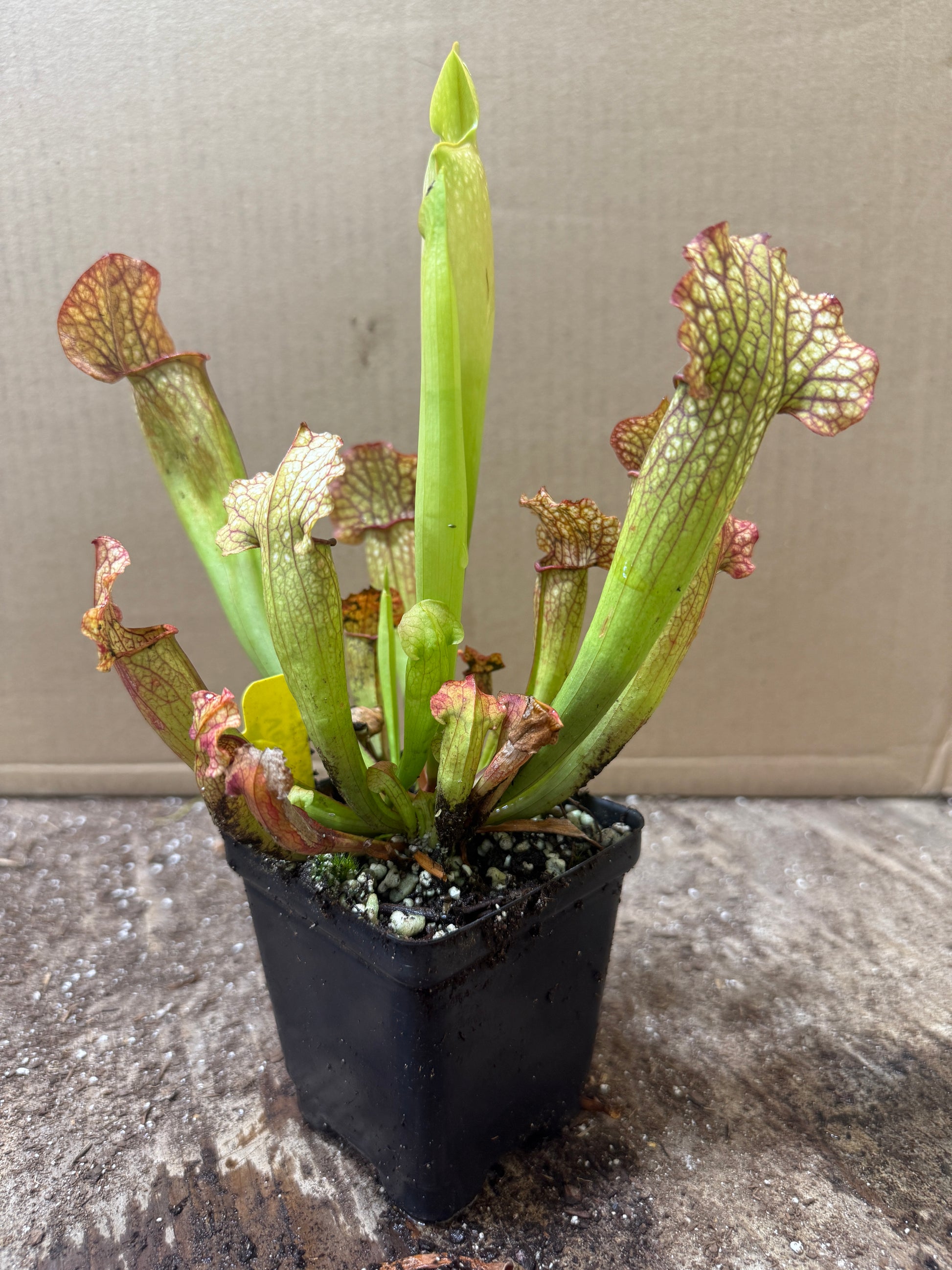 Sarracenia ‘Velvet’ is a striking cultivar with elegantly shaped, upright pitchers that develop rich maroon to purple tones, often with a velvety matte finish—especially when grown in full sun. Mature pitchers typically reach 12 to 20 inches tall, forming a graceful clump over time. Its refined coloring and smooth texture give this plant a unique, luxurious appearance that stands out in any carnivorous plant collection or bog garden.